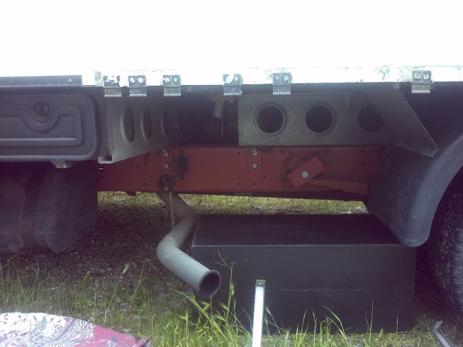 Una volta pronto ho montato il serbatoio cercando di tenerlo per quanto possibile verso l'esterno del mezzo e quindi lontano dalla balestra. Inoltre c'è un perno solidale col telaio Iveco che sorregge il supporto di gomma della marmitta; anche se è fisso rispetto al serbatoio ho preferito tenerlo il più lontano possibile (circa 1 cm).