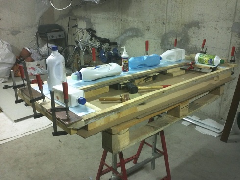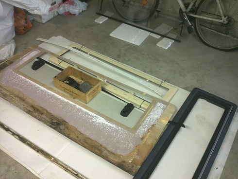 10) preparazione dei legni di abete (spessore 26,5 mm circa) per il nuovo telaio e incollaggio tramite colla poliuretanica WD4 (attenzione perchè tende a schiumare e aumentare un po' di volume durante la prima fase di asciugatura). Connessione dei legni tra loro tramite colla e punti metallici;