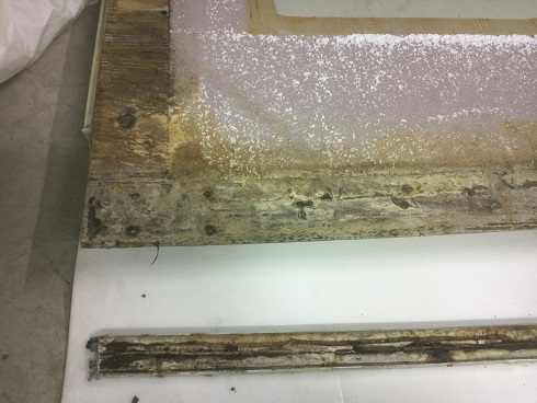 3b) asportazione del pannello interno in PVC (incollato al telaio in legno e polistirene tramite colla rossa ormai vetrificata). Asportazione della cornice della finestra (unita al telaio tramite sigillante grigio per idraulica);